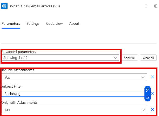 Durch den "Subject Filter" und "Only with Attachments" Filter werden nur E-Mails durch den Flow verarbeitet, die potenziell Rechnungen enthalten. Sie müssen also Rechnung im Betreff enthalten und Anhänge haben.